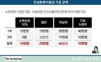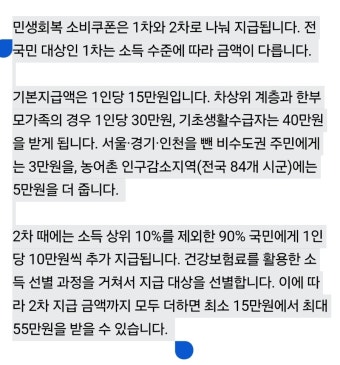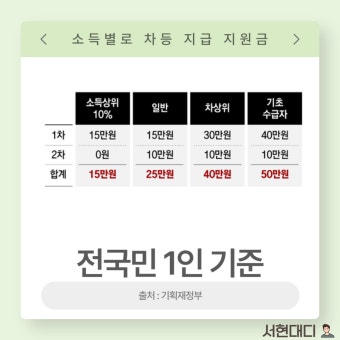 | 지급 대상 및 금액 | 1차: 전 국민 기본 15만원 + 소득/지역별 추가 지원 (최대 40만원). 2차: 1차 대상 중 소득 상위 10% 제외 90%에게 10만원 추가 지급. | 전 국민 대상이지만, 2차에서는 차등 지급을 통해 재정 건전성과 효율성을 고려. 소득 상위 10% 제외 기준이 핵심 논란. |